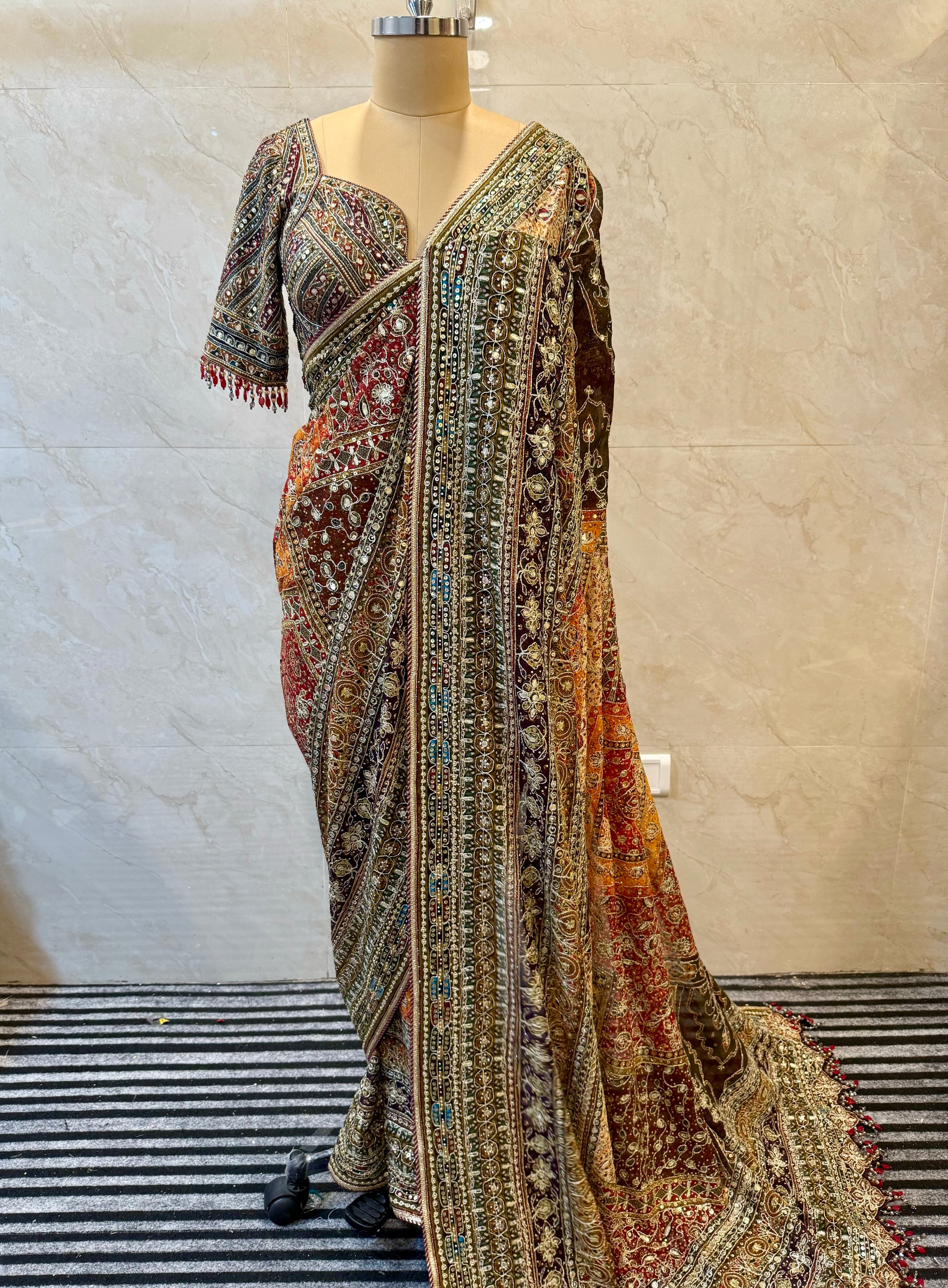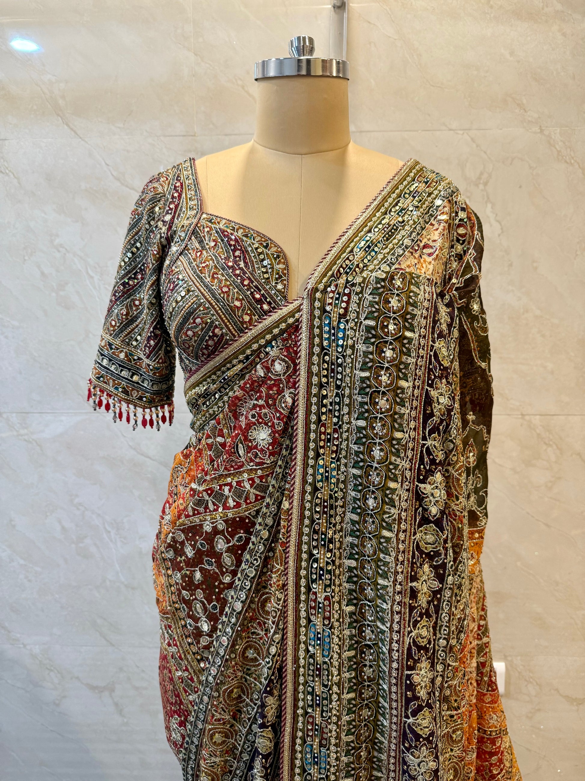 Bring vibrance and elegance together with this green georgette saree, beautifully enhanced with touches of red, yellow, and brown that add depth and charm to its look. The saree features intricate Swarovski embellishments, sequin detailing, and pearl handwork, giving it a subtle shimmer that catches the light beautifully. The delicate aari embroidery and handcrafted motifs complete the design, blending modern style with traditional finesse.