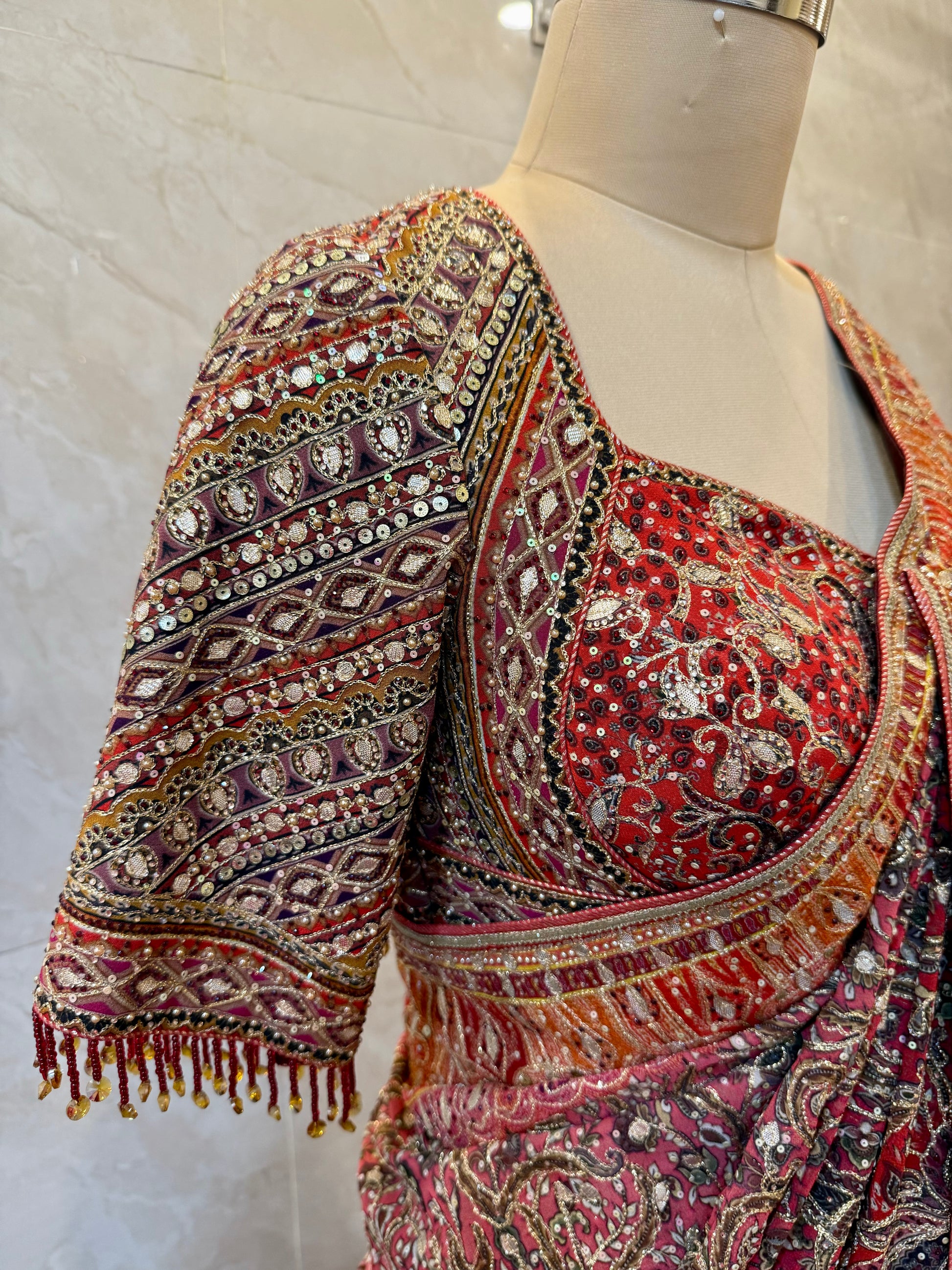 Bring color and elegance together with this stunning multicolor georgette saree, featuring rich shades of red, yellow, and orange that flow beautifully into each other. The saree is adorned with detailed gota patti work, shimmering sequins, Swarovski stones, and pearl handwork, giving it a perfect festive glow. Each section of the saree showcases fine aari embroidery and handcrafted motifs, adding charm and craftsmanship to the look.