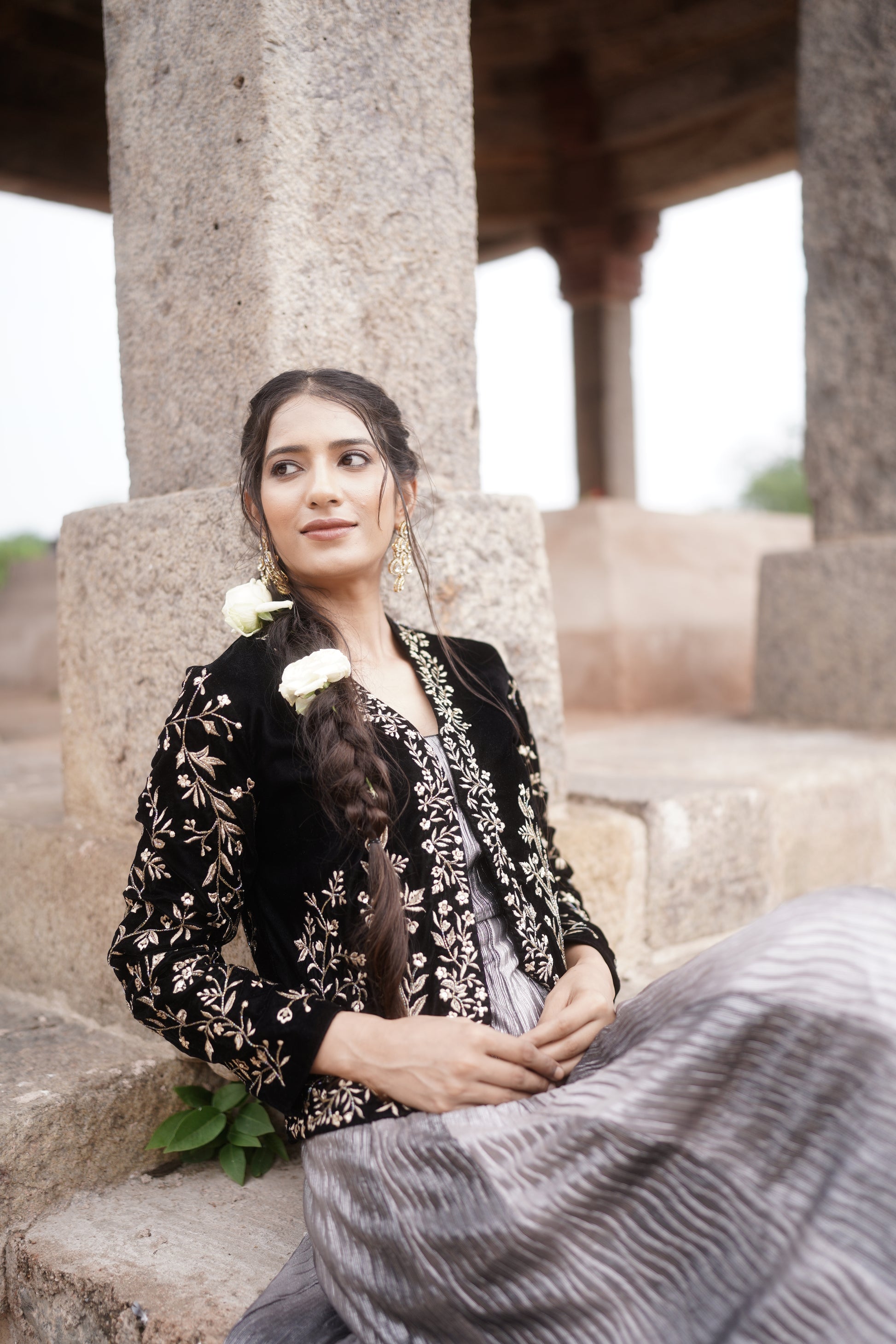 Velvet jacket adorned with rich gold hand embroidery, offering a regal and elegant finish to any outfit.