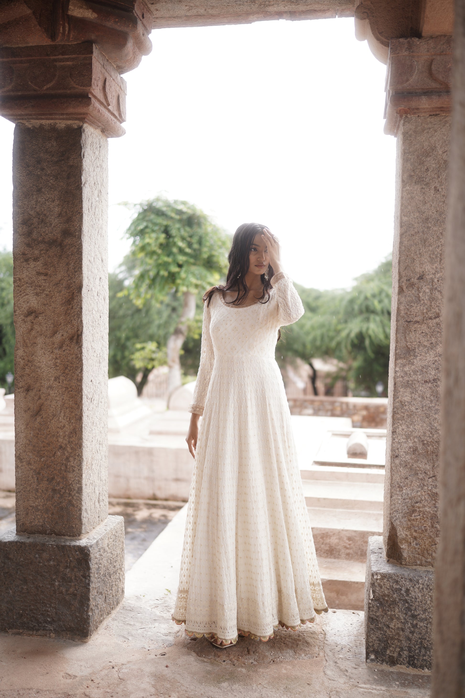 White georgette Anarkali beautifully detailed with chikankari embroidery, paired with a matching churidar and a soft georgette dupatta to complete the elegant look.