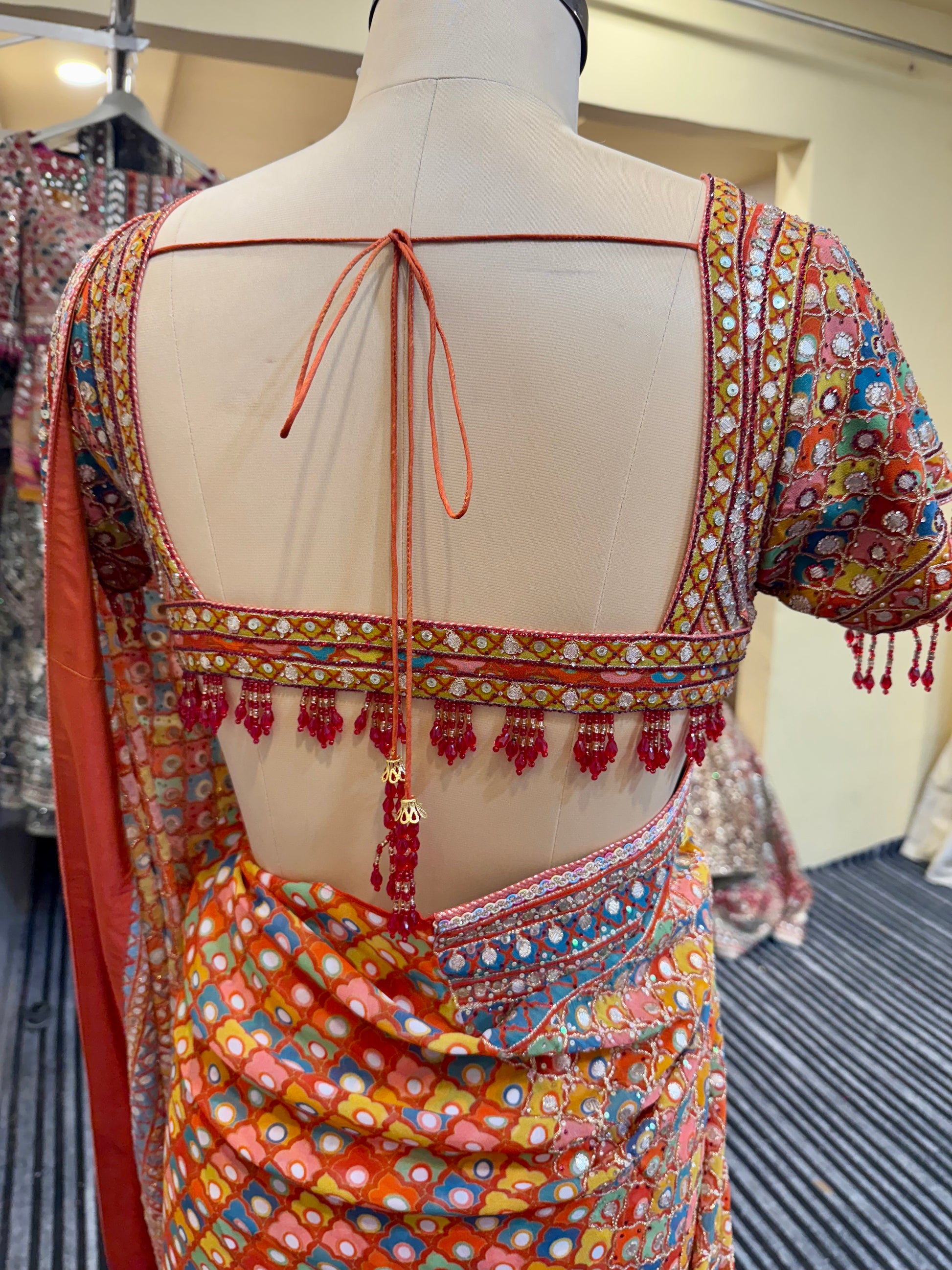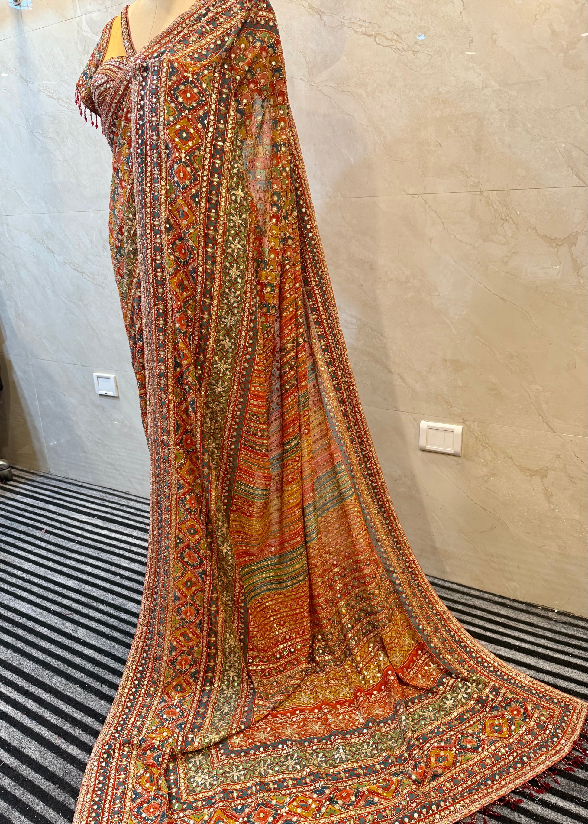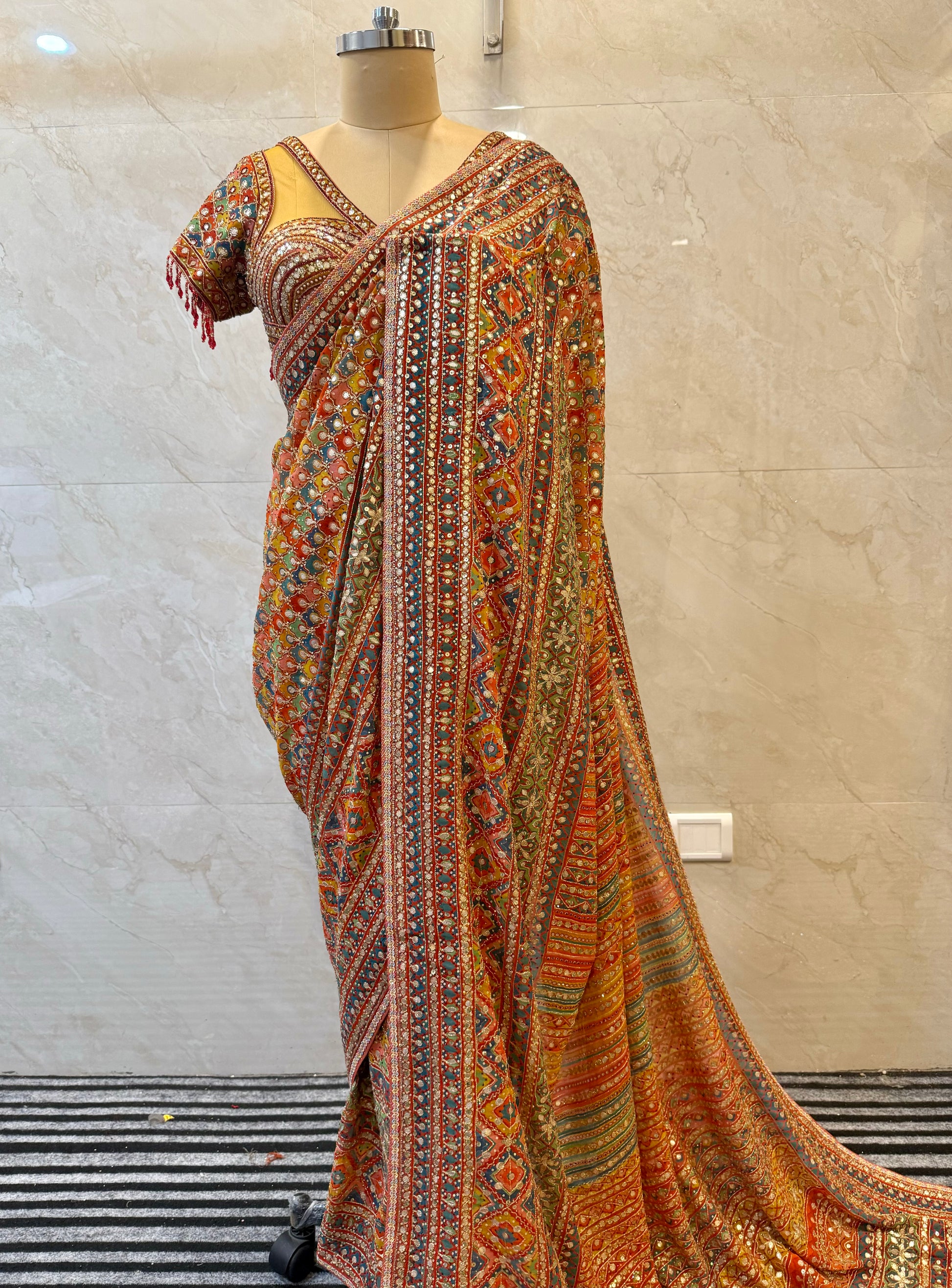 Work: Gota patti, Swarovski, pearl Moti, sequin, aari embroidery, and motifs